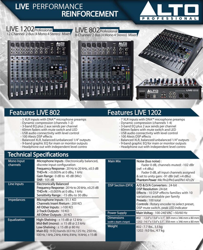 ALTO LIVE-802 มิกเซอร์อนาล็อกขนาดเล็ก ฟังก์ชั่นจัดเต็ม สามารถเลือกความถี่ในการ EQ เสียงกลางได้ LIVE-802 จุดเด่นอยู่ที่เอฟเฟคคุณภาพ เสียงใส เหมาะกับงานคาราโอเกะเล็ก ๆ งานพูด และงานอีเวนท์ที่ไม่ต้องใช้แชนแนลเยอะ และมีเอฟเฟคในตัว คุณภาพจาก ALTO เหมาะสำหรับใช้งานทั้งในสตูดิโอหรือแม้แต่แบบ live ก็ย่อมได้ มีฟังก์ชันครบ จุดเด่น