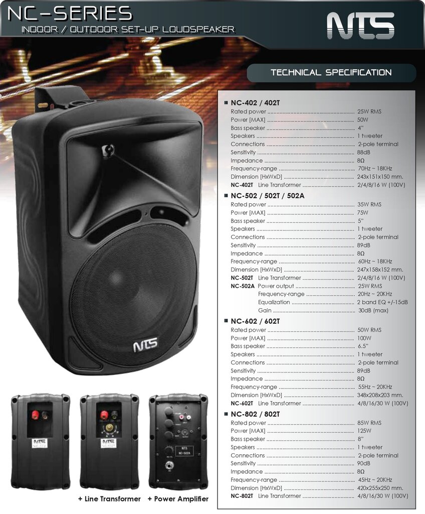ตู้ลำโพงติดผนัง 8 นิ้ว NTS NC 802 + ขา · กำลังไฟ : 85W RMS · กำลัง [สูงสุด] : 125W · ลำโพงเบส : นิ้ว · ลำโพง : 1 ทวีตเตอร์ · ขั้วต่อ : 2 ขั้ว · SPL : สูงสุด 90dB · อิมพีแดนซ์ : 8Ω · ช่วงความถี่ : 45Hz - 20KHz · ขนาด [สxกxล] : 420 x 255 x 250 มม. |