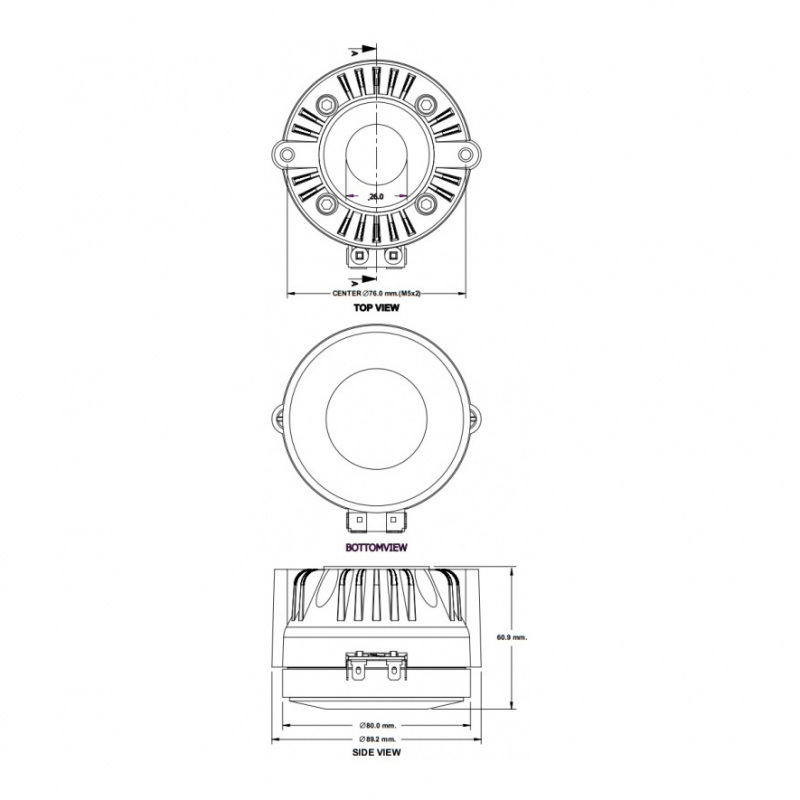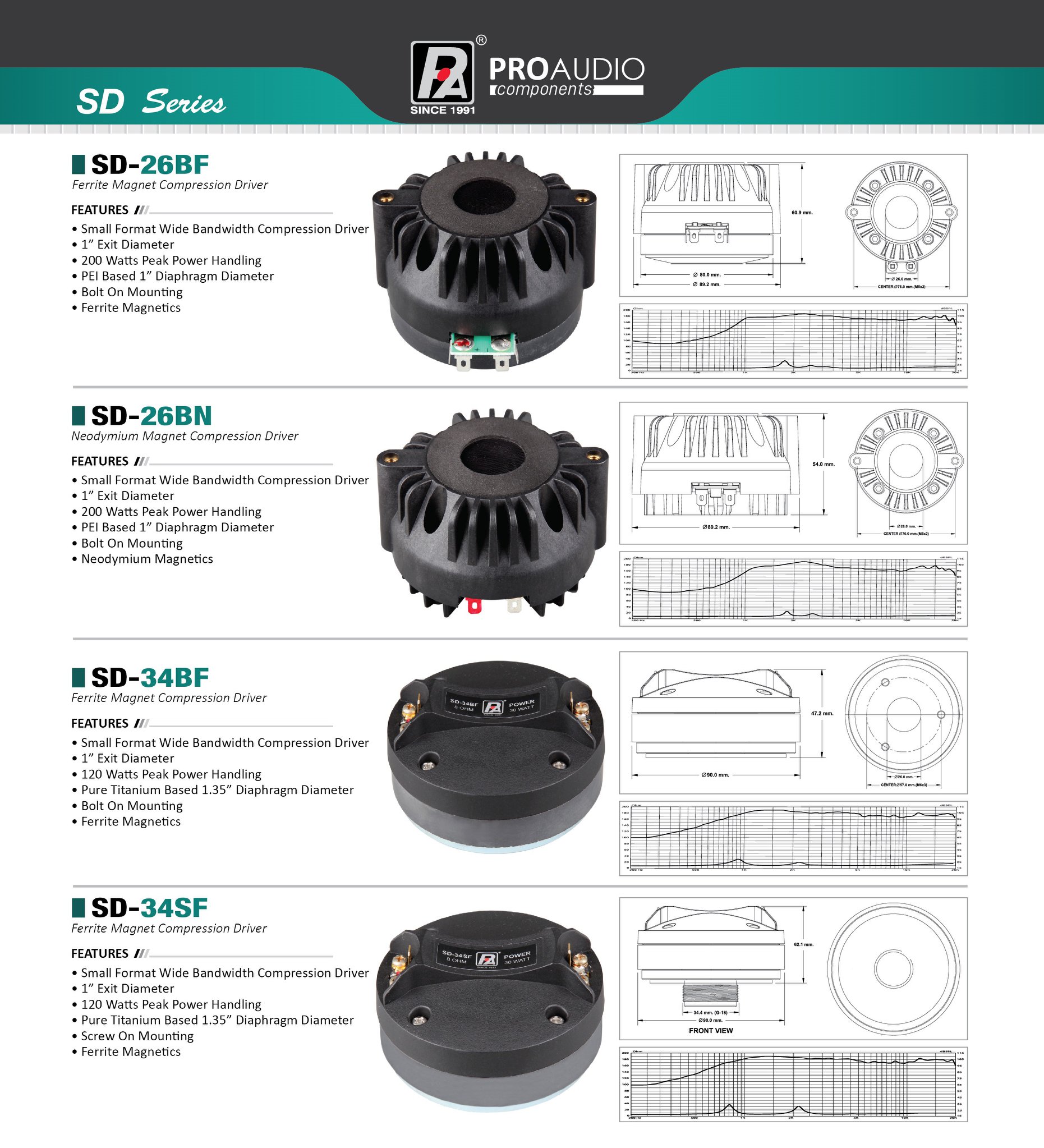 The P Audio SD-26BF is a small format compression driver that utilizes a precision formed diaphragm assembly. The diaphragm assembly is close spaced to a precision phase plug to ensure excellent acoustic loading. The SD-26BF has an operating range of 1800Hz to 20000Hz and is ideally suited for two way and three way high frequency applications in professional sound reinforcement systems. The SD-26BF is a ferrite based magnetic system with an industry standard 1 inch (25.4mm) exit diameter. The mounting configuration is a standard bolt on style. P Audio offers a wide variety high frequency horns that will provide excellent pattern control and acoustic loading for the SD-26BF. The diaphragm assembly is a 1 inch (25.4mm) diameter aluminium design which utilizes P Audio's very high temperature adhesive systems and precision manufacturing to ensure high power handling and reliability. The construction yields a full 50 watts of power handling capacity. Features