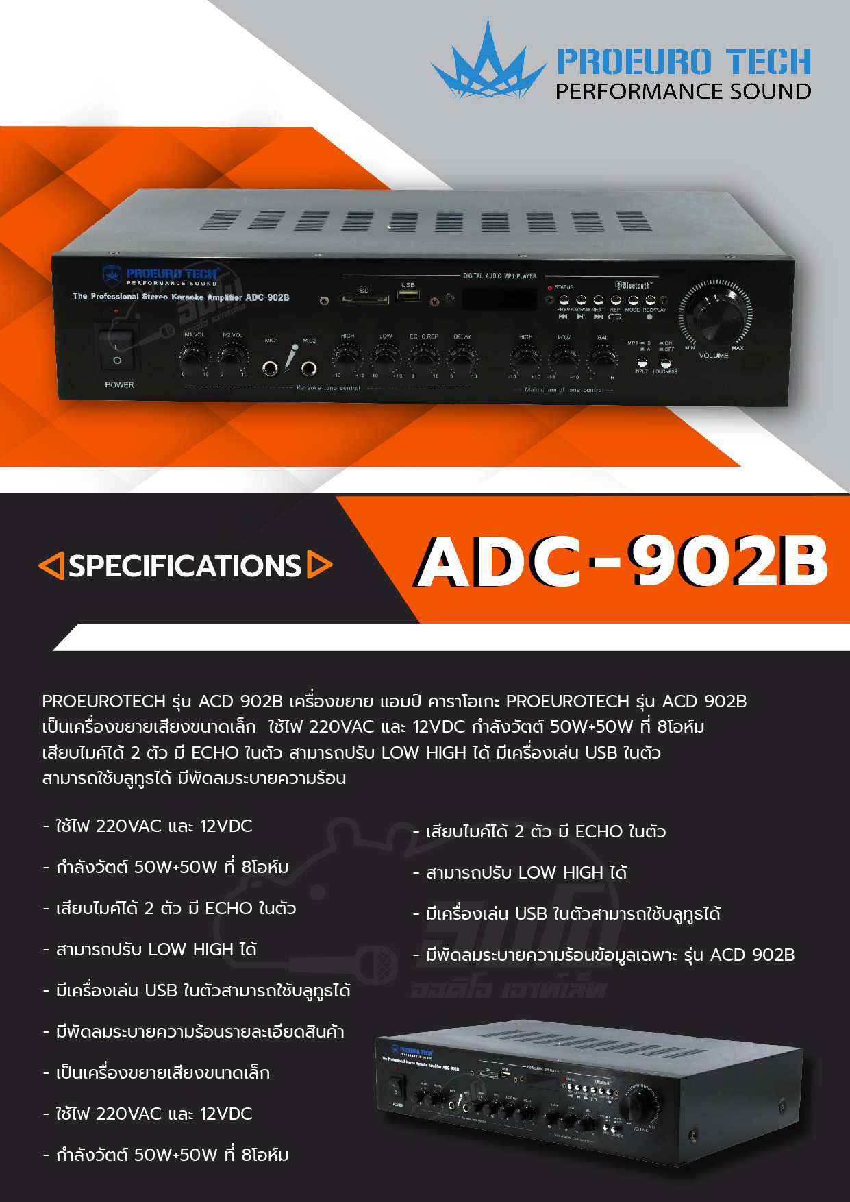 PROEUROTECH รุ่น ACD 902B เครื่องขยาย แอมป์ คาราโอเกะ PROEUROTECH รุ่น ACD 902B เป็นเครื่องขยายเสียงขนาดเล็ก ใช้ไฟ 220VAC และ 12VDC กำลังวัตต์ 50W+50W ที่ 8โอห์ม เสียบไมค์ได้ 2 ตัว มี ECHO ในตัว สามารถปรับ LOW HIGH ได้ มีเครื่องเล่น USB ในตัวสามารถใช้บลูทูธได้ มีพัดลมระบายความร้อนข้อมูลเฉพาะ - ใช้ไฟ 220VAC และ 12VDC