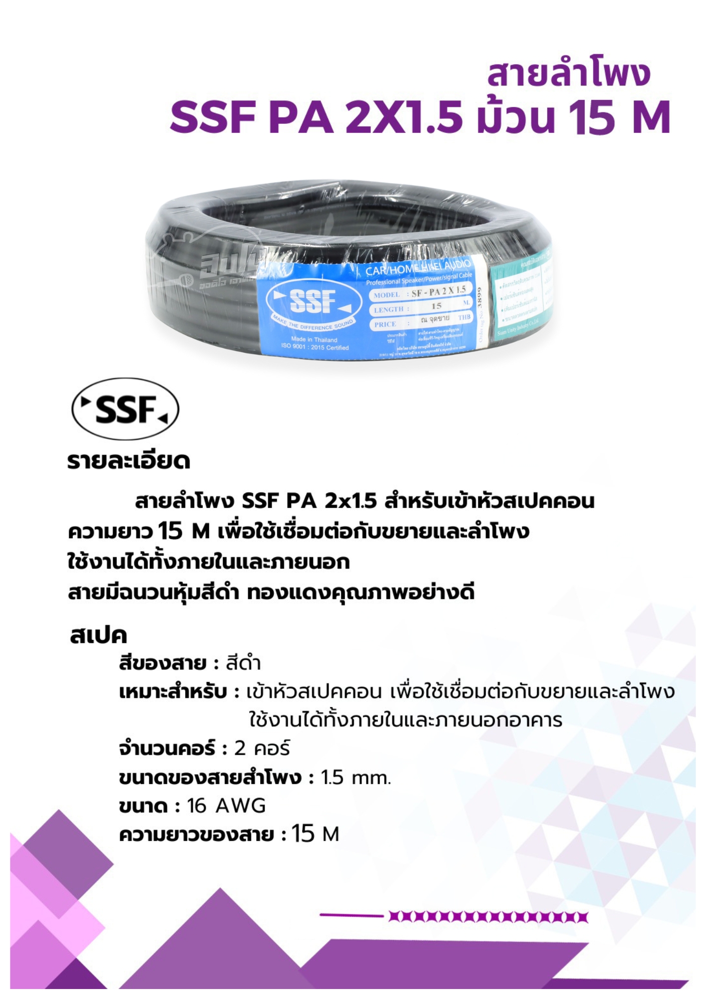 ⚙️ SSF PA 2x1.5 สายลำโพงคุณภาพสูง (ม้วน 15 เมตร)ประเภท: สายลำโพง 🧩 คำอธิบายสินค้าสายลำโพง SSF รุ่น PA 2x1.5 เป็นสายทองแดงคุณภาพสูง (CCAM – Copper Clad Aluminum Magnesium) 🌟 จุดเด่นสินค้า