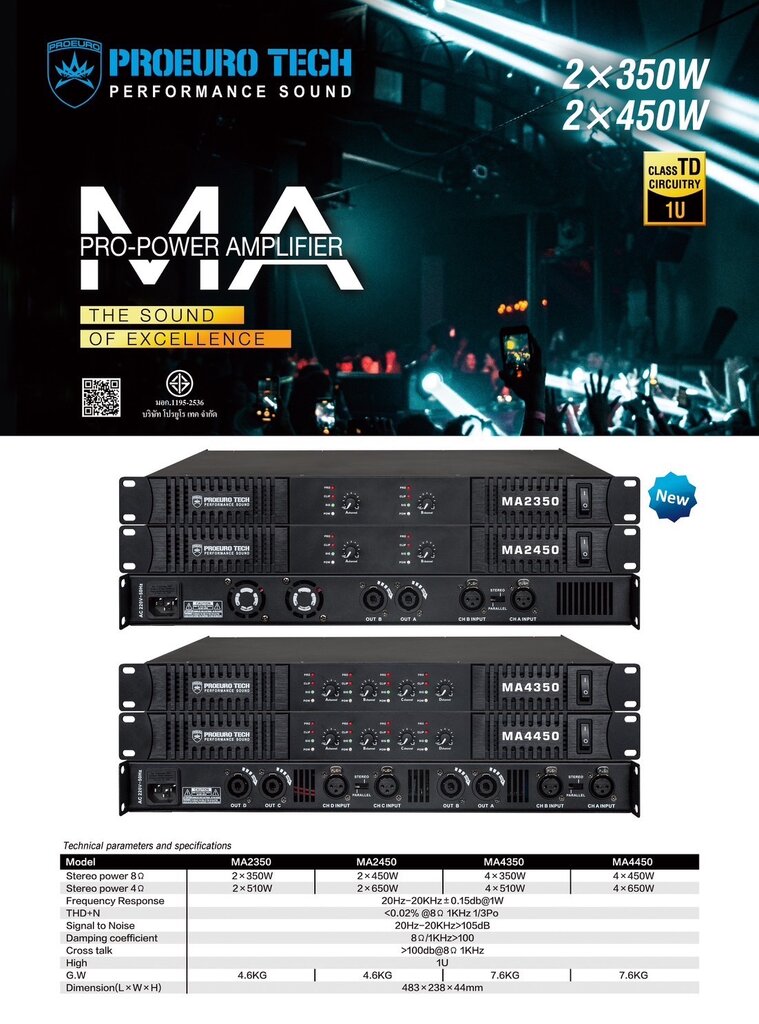 POWERAMP ขนาด 1U 4CH Specification MODEL MA – 4450 Stereo power 8Ω 4X450W Stereo power 4Ω 4X650W Frequency Response 20Hz-20KHz±0.15db db@1W THD+N <0.02%@80Ω 1KHz 1/3Po Signal fo Noise 20Hz-20KHz 105dB Damping coefficient 8Ω /1KHz > 100 Cross talk > 100DB@8Ω 1KHz ขนาด 1U ![]() |