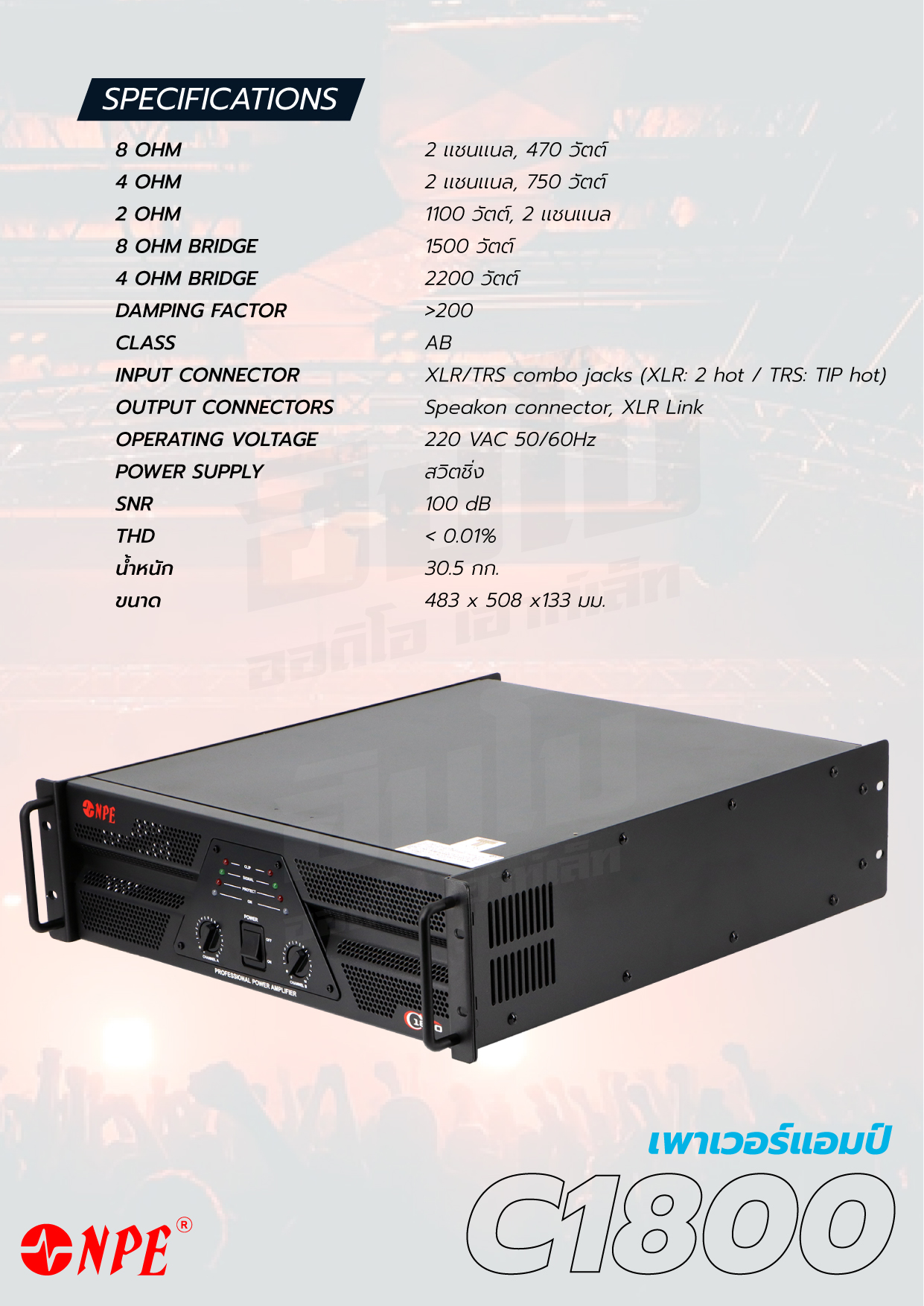 NPE C 1800 เพาเวอร์แอมป์C-1800 เพาเวอร์แอมป์ Class-AB ที่ขับเสียงได้สุดยอด มีคุณภาพสูง มีความผิดเพี้ยนน้อย เพื่องานบันเทิงเต็มรูปแบบ C-1800 มาพร้อมกับระบบการจัดการพลังงานที่ตอบสนองอย่างฉับไว มีระบบป้องกันที่หลากหลาย วงจรจำกัดกระแสกรณีสายลำโพงช๊อต C-1800 มีช่องเชื่อมต่อที่หลากหลาย XLR มีลิงค์พ่วงต่อ ตามมาตรฐาน PA อีกทั้งยังให้คุณภาพเสียงที่ยอดเยี่ยม โดยตอบสนองความถี่ที่ 20 Hz – 20 KHz คุณสมบัติ