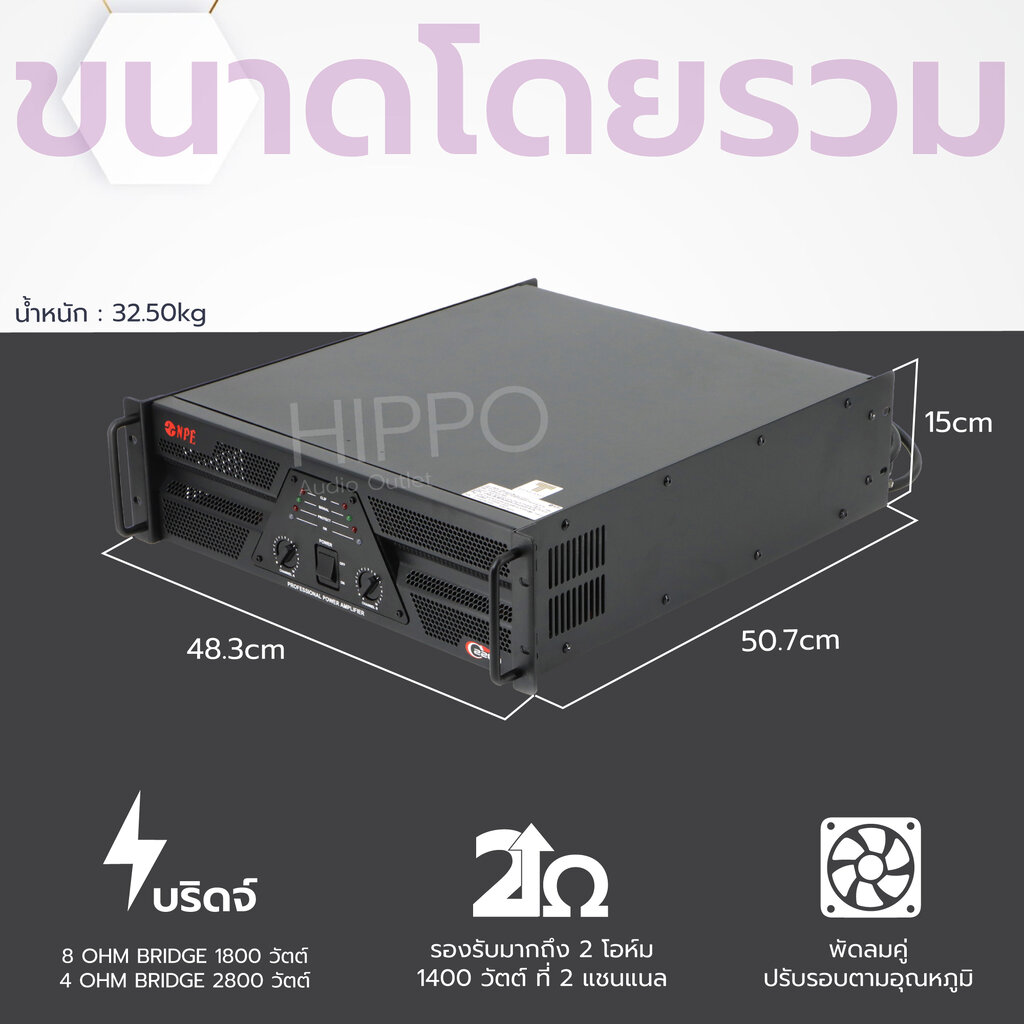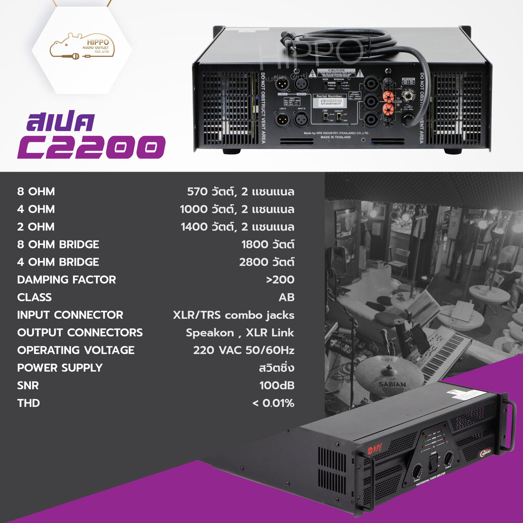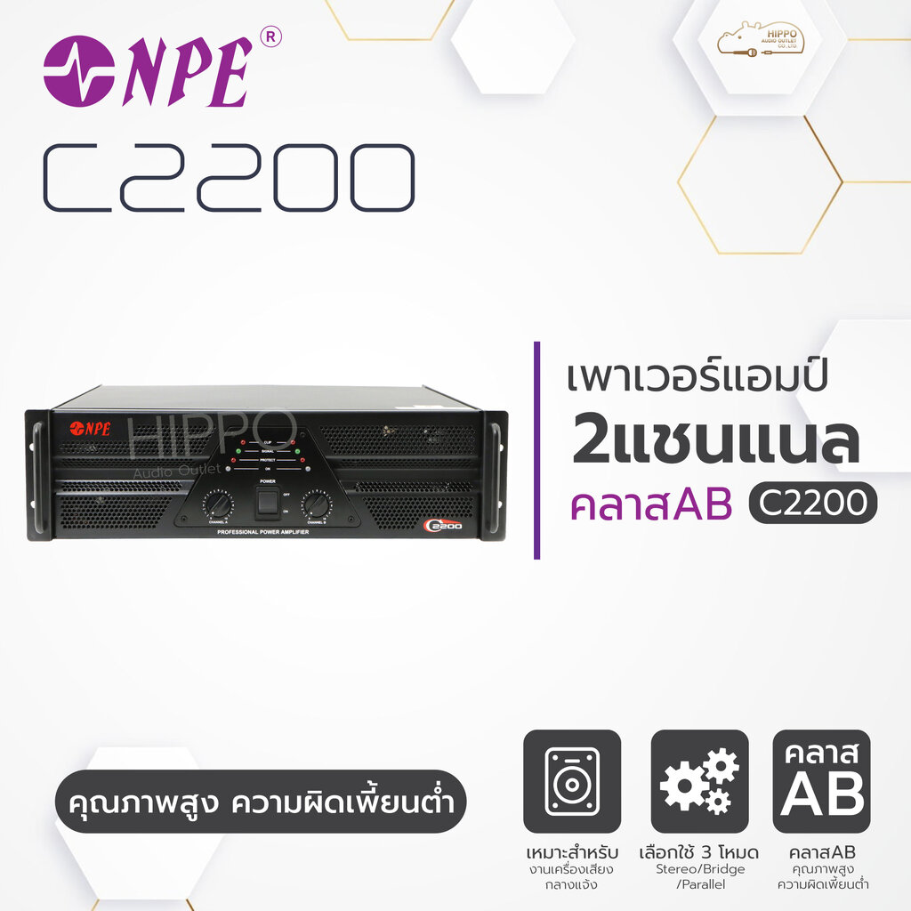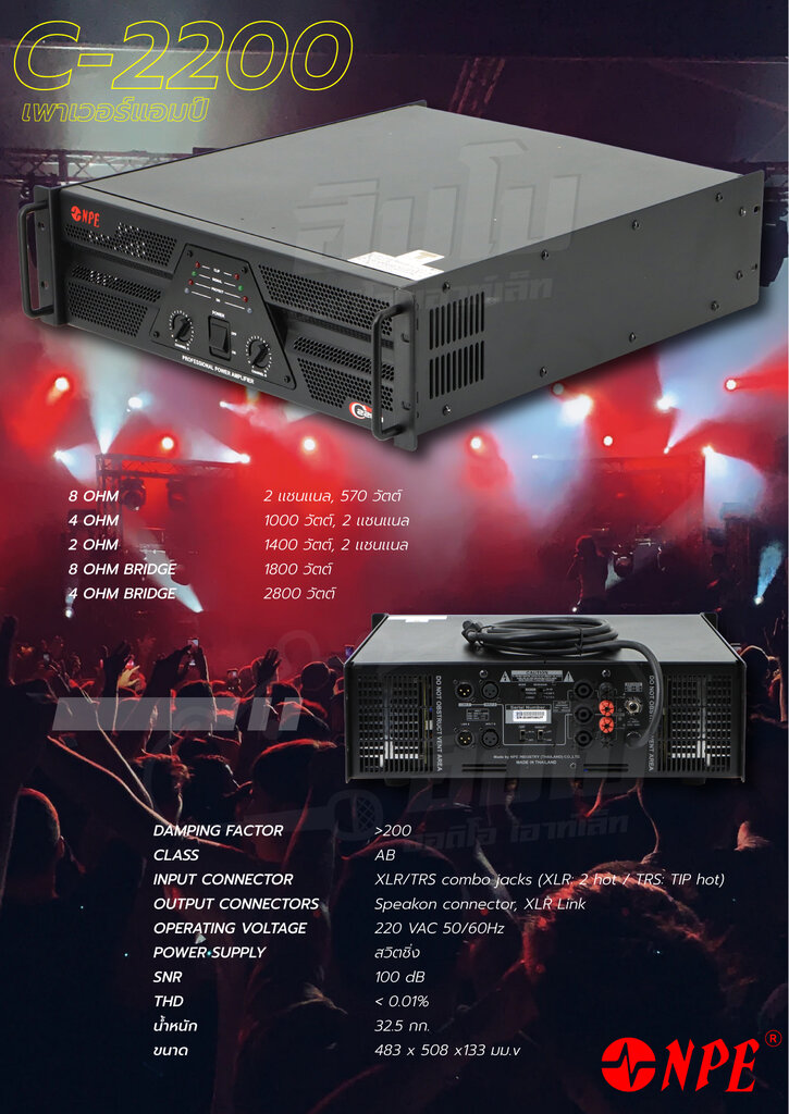 NPE C-2200 เพาเวอร์แอมป์C-2200 เพาเวอร์แอมป์ Class-AB ที่ขับเสียงได้สุดยอด มีคุณภาพสูง มีความผิดเพี้ยนน้อย เพื่องานบันเทิงเต็มรูปแบบ C-2200 มาพร้อมกับระบบการจัดการพลังงานที่ตอบสนองอย่างฉับไว มีระบบป้องกันที่หลากหลาย วงจรจำกัดกระแสกรณีสายลำโพงช๊อต C-2200 มีช่องเชื่อมต่อที่หลากหลาย XLR มีลิงค์พ่วงต่อ ตามมาตรฐาน PA อีกทั้งยังให้คุณภาพเสียงที่ยอดเยี่ยม โดยตอบสนองความถี่ที่ 20 Hz – 20 KHz คุณสมบัติ