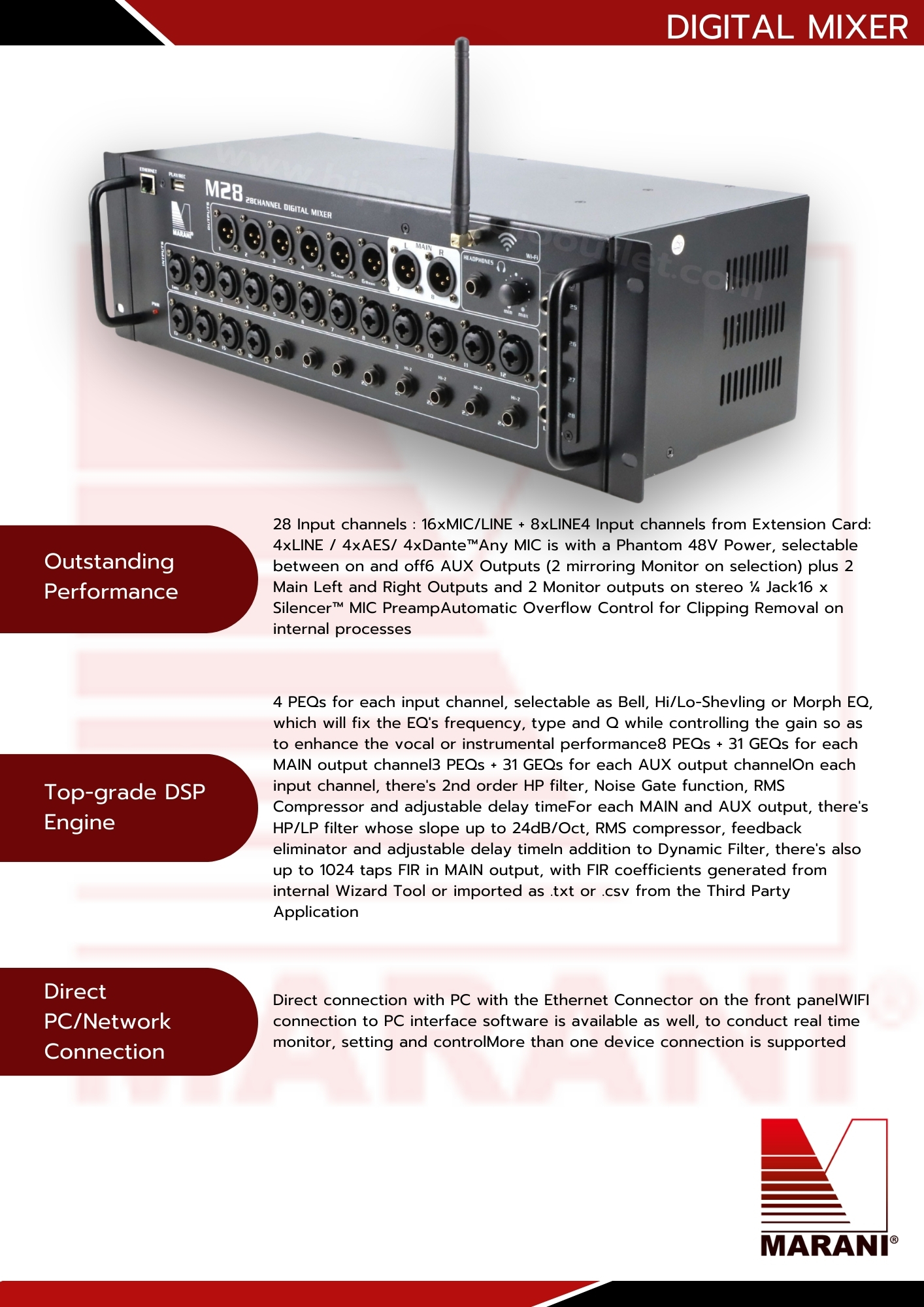 M28 เป็นมิกเซอร์ดิจิตอลประสิทธิภาพสูงที่มีขนาด 3 U ซึ่งออกแบบมาเพื่อการใช้งานที่หลากหลายในสตูดิโอและการแสดงสด ด้านหน้าเครื่องมีขั้วต่ออินพุต 24 ช่อง โดย 16 ช่องสามารถใช้ได้ทั้ง MIC และ LINE อินพุต ในขณะที่ 8 ช่องที่เหลือเป็น LINE อินพุตแบบแจ็ค นอกจากนี้ยังมีขั้วต่อหูฟังที่สามารถปรับเกนได้เพื่อใช้เป็น MONITOR OUTPUT มิกเซอร์ M28 รองรับการบันทึกเสียงแบบสเตอริโอผ่าน USB โดยการเชื่อมต่อ USB Stick กับขั้วต่อ USB ด้านหน้า สามารถเลือกแหล่งบันทึกจากช่องอินพุตหรือเอาท์พุตได้ และรองรับการเล่นเสียงกลับแบบสเตอริโอหรือสองช่องสัญญาณ M28 ใช้ MARANI DSP engines ที่ทรงพลังเพื่อประมวลผลเสียงขั้นสูง เช่น การกรอง FIR สูงสุด 1024 taps บน MAIN LEFT และ RIGHT Outputs, Effects, Ducker, RTA, Feedback Eliminator, Automixer และอื่น ๆ ทุกช่องอินพุตและเอาท์พุตมี Parametric Equalization, RMS Compressor, delay และการประมวลผลอื่น ๆ ที่จำเป็น และทุกช่องเอาท์พุตยังมี Graphic Equalizer 31 แบนด์ M28 มาพร้อมกับโมดูล WIFI ในตัว ทำให้สามารถเชื่อมต่อกับซอฟต์แวร์อินเตอร์เฟสบน PC หรือแอพ iPad เพื่อการมอนิเตอร์และแก้ไขพารามิเตอร์แบบเรียลไทม์ได้อย่างสะดวก เหมาะสำหรับการใช้งานในสตูดิโอและการแสดงสด อุปกรณ์สามารถเชื่อมต่อกับ WiFi ได้ถึง 4 การเชื่อมต่อ (PC หรือ iPad) และการเชื่อมต่อ Ethernet ได้ 10 การเชื่อมต่อ (PC) รวมเป็น 14 อุปกรณ์ที่เชื่อมต่อพร้อมกัน หากมีการปรับตั้งค่า M28 ด้วยอุปกรณ์ใด การเปลี่ยนแปลงจะถูกส่งต่อไปยังอุปกรณ์อื่นที่เชื่อมต่ออยู่โดยอัตโนมัติ การอัปเดตเฟิร์มแวร์ก็สามารถทำได้ง่าย ๆ ผ่านซอฟต์แวร์ M28 ยังสามารถเพิ่มช่องอินพุตอีก 4 ช่องผ่านการ์ดขยายที่สามารถเลือกได้หลายแบบ เช่น อนาล็อกมาตรฐาน, AES หรือ Dante Features Outstanding Performance 28 Input channels : 16xMIC/LINE + 8xLINE 4 Input channels from Extension Card: 4xLINE / 4xAES/ 4xDante Any MIC is with a Phantom 48V Power, selectable between on and off 6 AUX Outputs (2 mirroring Monitor on selection) plus 2 Main Left and Right Outputs and 2 Monitor outputs on stereo Jack 16 x Silencer MIC Preamp Automatic Overflow Control for Clipping Removal on internal processes Top-grade DSP Engine 4 PEQs for each input channel, selectable as Bell, Hi/Lo-Shevling or Morph EQ, which will fix the EQ's frequency, type and Q while controlling the gain so as to enhance the vocal or instrumental performance 8 PEQs + 31 GEQs for each MAIN output channel 3 PEQs + 31 GEQs for each AUX output channel On each input channel, there's 2nd order HP filter, Noise Gate function, RMS Compressor and adjustable delay time For each MAIN and AUX output, there's HP/LP filter whose slope up to 24dB/Oct, RMS compressor, feedback eliminator and adjustable delay time In addition to Dynamic Filter, there's also up to 1024 taps FIR in MAIN output, with FIR coefficients generated from internal Wizard Tool or imported as .txt or .csv from the Third Party Application Direct PC/Network Connection Direct connection with PC with the Ethernet Connector on the front panel WIFI connection to PC interface software is available as well, to conduct real time monitor, setting and control More than one device connection is supported SPECIFICATIONS