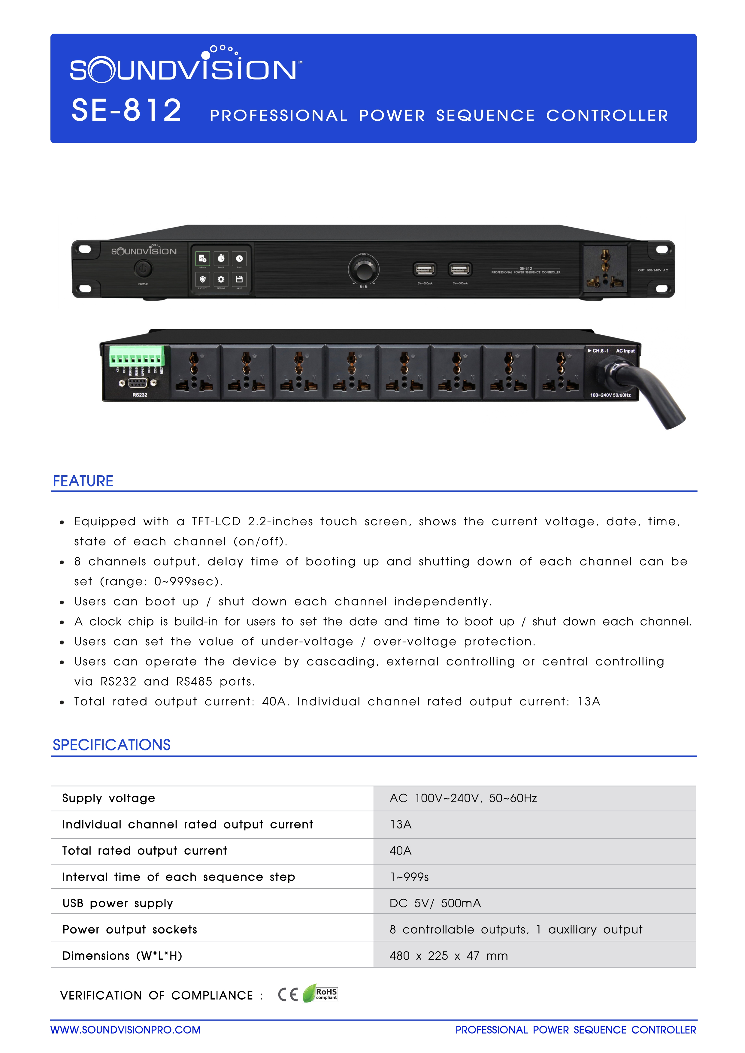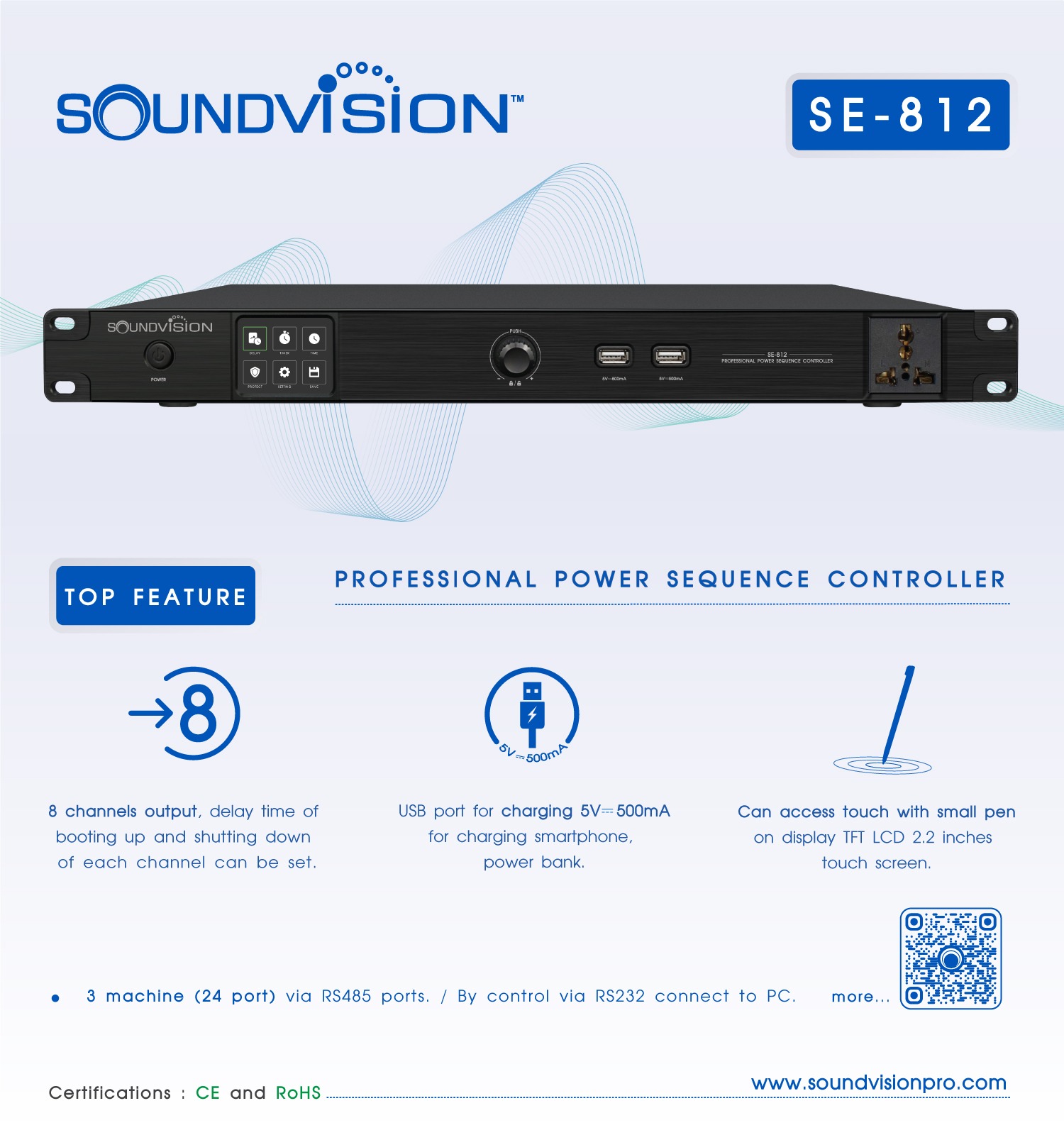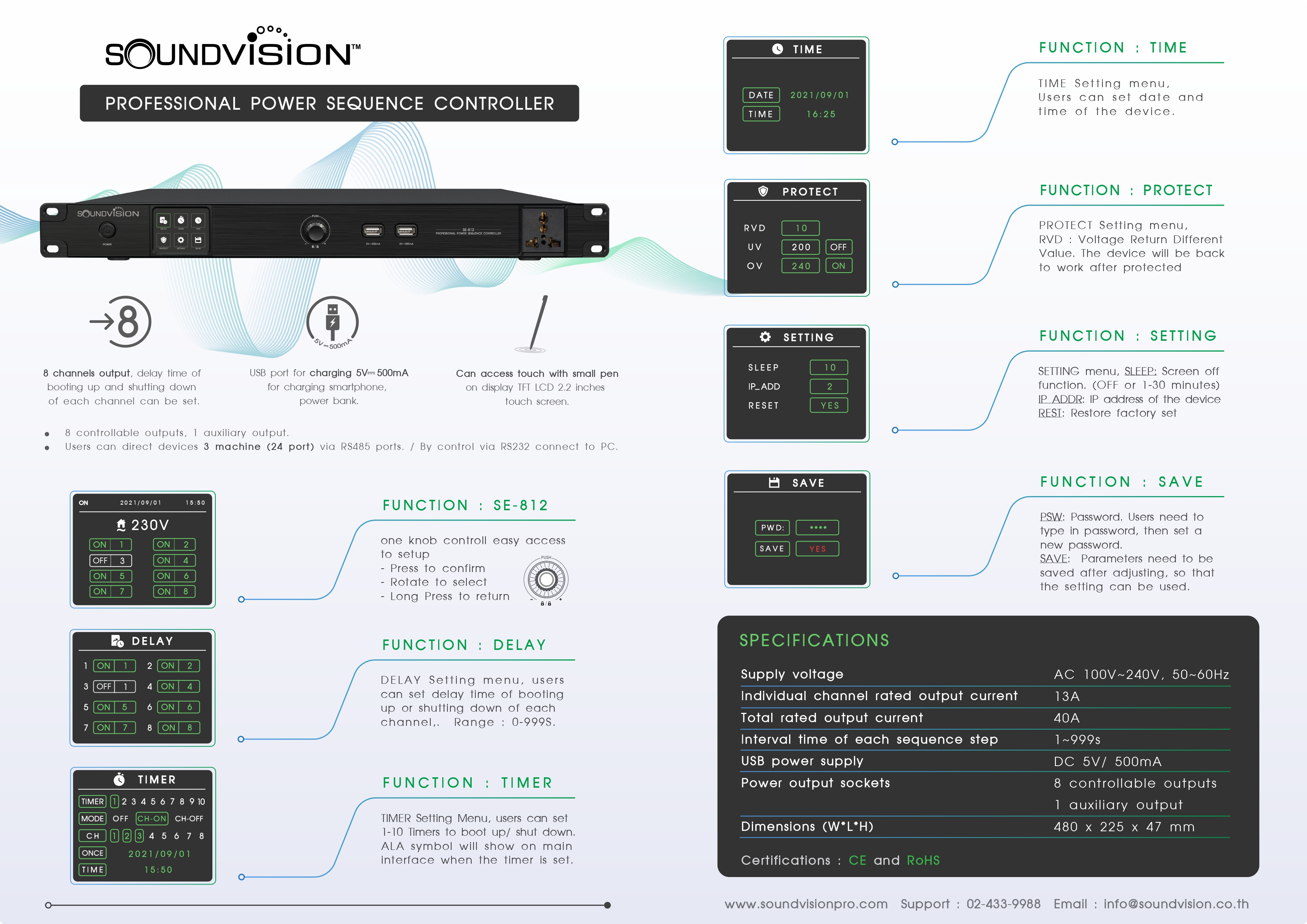 SE-812 เครื่องจัดลำดับการจ่ายไฟอัตโนมัติ ควบคุมการจัดเรียงลำดับเวลาเปิด/ปิดอุปกรณ์ที่ทรงพลัง และทำงานได้อย่างอัจฉริยะ ออกแบบมาโดยเฉพาะสำหรับระบบเสียงระดับมืออาชีพ ไปจนถึงงานระบบเสียงประชุม และระบบเสียงติดตั้งสามารถเปิด และปิดอุปกรณ์ประเภทต่างๆ ได้ตามลำดับ หลีกเลี่ยงความเสียหายของอุปกรณ์ในระบบเสียง ที่อาจเกิดขึ้นจากการทำงานผิดพลาด เช่น หยุดการทำงานของอุปกรณ์ชั่วขณะ เมื่อเกิดปัญหาทางด้านไฟฟ้า, ป้องกัน หรือลดทอนปัญหาไฟตก-เกิน หรือไฟกระชาก จากการเปิด/ปิดอุปกรณ์ที่ไม่เหมาะสม เพื่อไม่ให้เกิดการสปาร์คของสัญญาณไปสู่อุปกรณ์เสียงที่มีมูลค่าของคุณ SE-812 เครื่องจัดลำดับการจ่ายไฟอัตโนมัติ ให้การใช้งานที่ง่าย และสะดวกด้วยหน้าจอสัมผัส TFT แสดงสถานะการทำงานต่างๆ