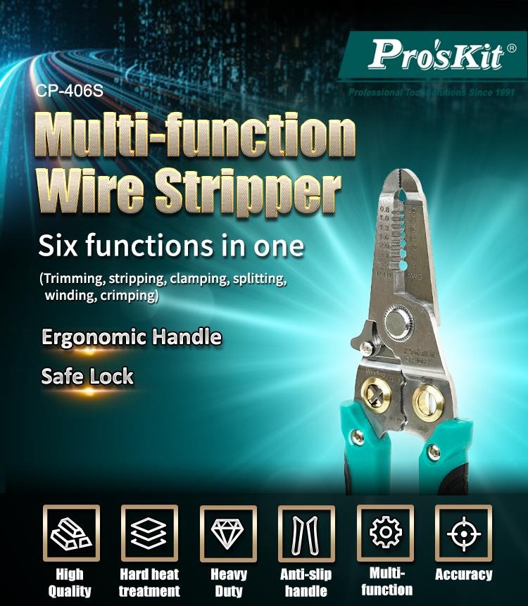 Pro'sKit CP-406SMulti-function Wire Stripper (คีมปอกสายไฟเอนกประสงค์) ✅ รายละเอียดสินค้า:• รองรับงานหลากหลาย: Clamping, Stripping, Cutting, Crimping, Winding, Splitting 🔧 จุดเด่น: