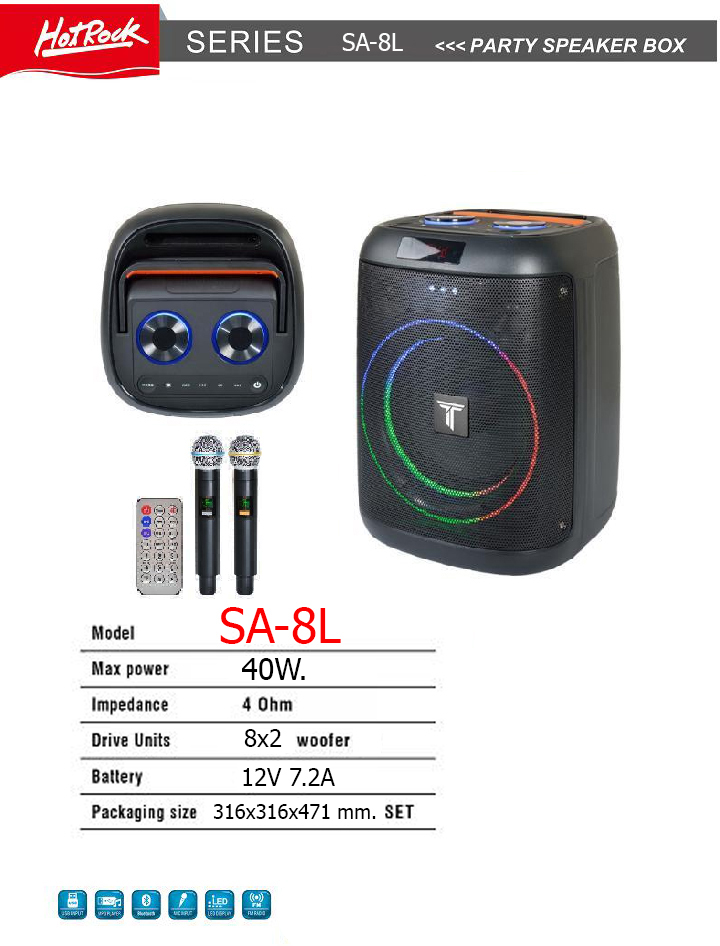 🔊 HOTROCK SA-8L ตู้ลำโพงบลูทูธพกพา 8 นิ้ว คู่ไมค์ไร้สายราคา: — (กรุณาติดต่อสอบถาม) 🧩 คำอธิบายสินค้าHotRock SA-8L คือ ตู้ลำโพงบลูทูธคาราโอเกะระดับพรีเมียม ขนาด 8 นิ้วคู่ ให้เสียงเบสแน่น รายละเอียดเสียงครบ 🌟 จุดเด่นสินค้า