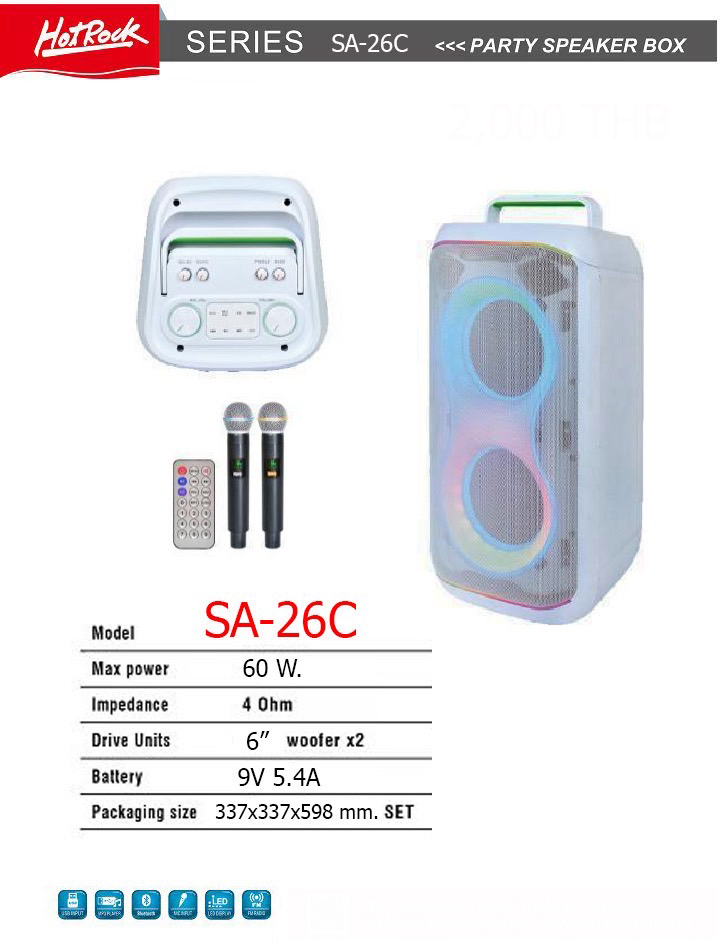 HotRock SA-26C คือตู้ลำโพงบลูทูธ ดีไซน์สีขาวโดดเด่น มาพร้อมดอกลำโพงคู่ขนาด 6 นิ้ว ให้พลังเสียง 60 วัตต์ ฟังสนุกทุกโอกาส รองรับการเชื่อมต่อครบทั้ง Bluetooth, USB, SD Card และยังมาพร้อมไมค์ลอยคู่ร้องสนุกได้ทันที เหมาะสำหรับงานปาร์ตี้ งานพูด งานบูธประชาสัมพันธ์ และใช้งานทั่วไปในบ้าน